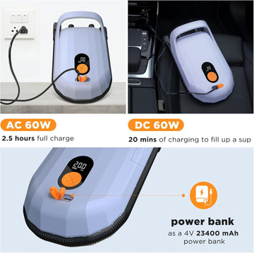- DC 60W: Get enough power in 20 minutes to inflate one SUP board